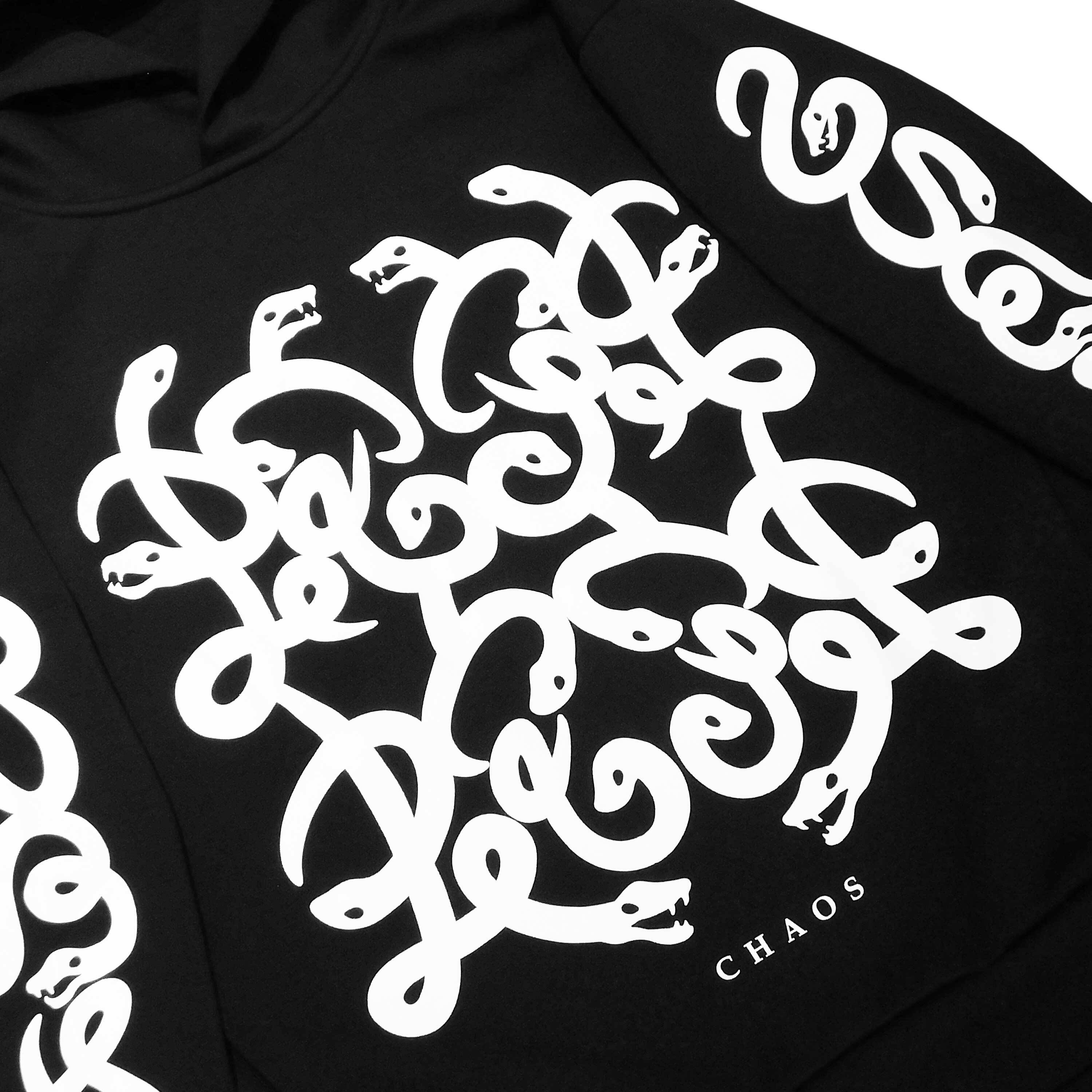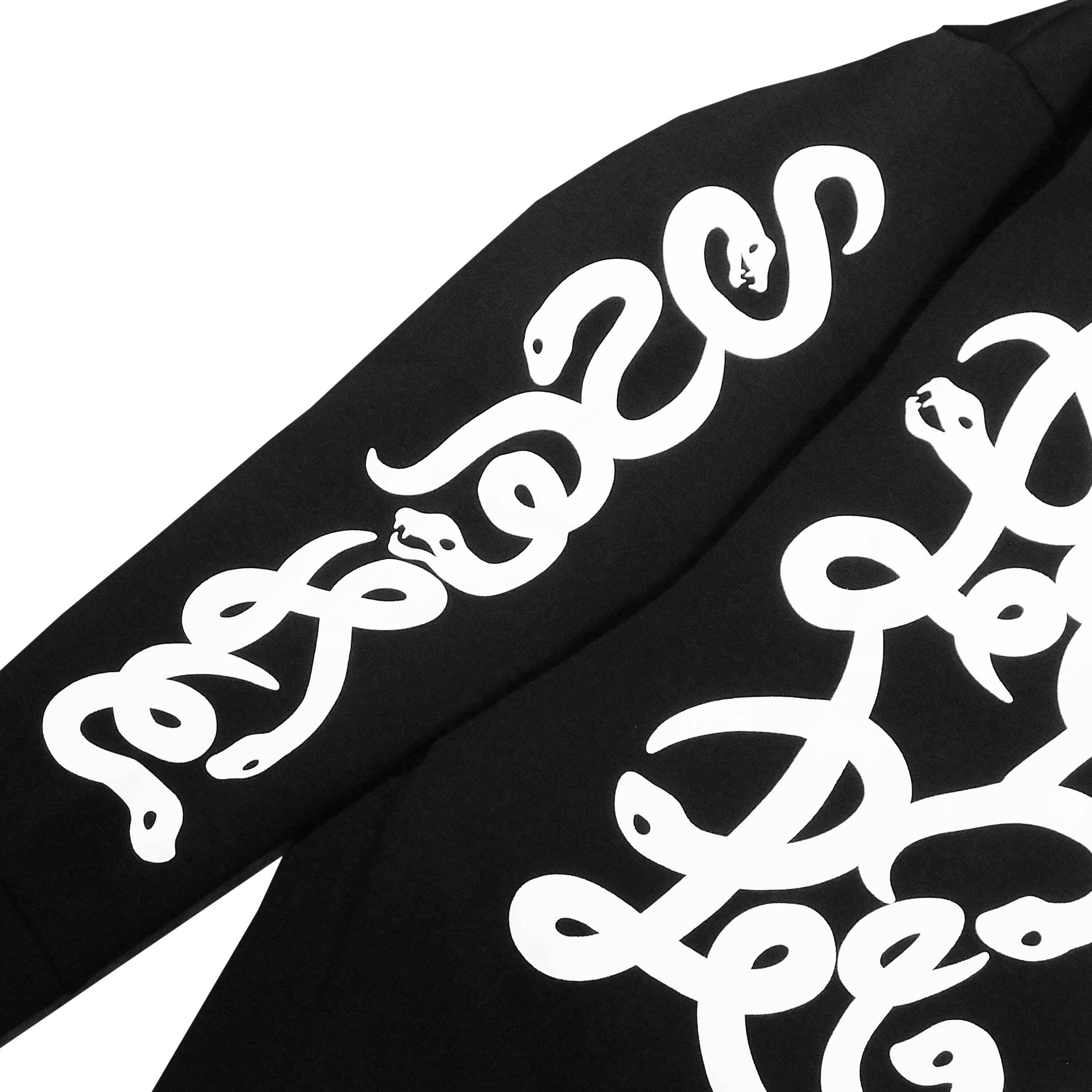 On the front, there are four snakes, and on both sleeves, the word "SNAKE" is depicted using snake motifs.
