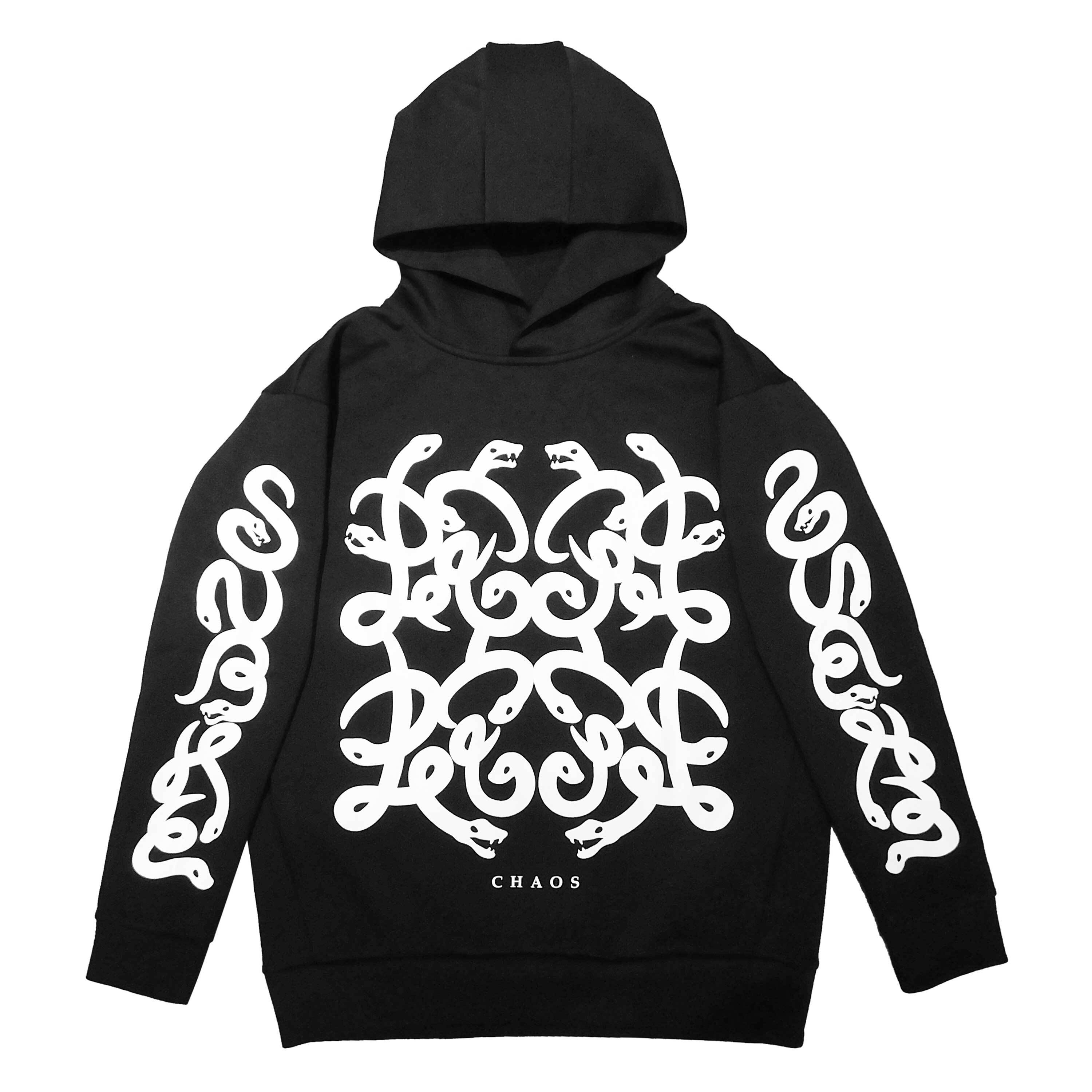 A pullover hoodie that expresses the kanji "蛇" (snake) using a snake design.