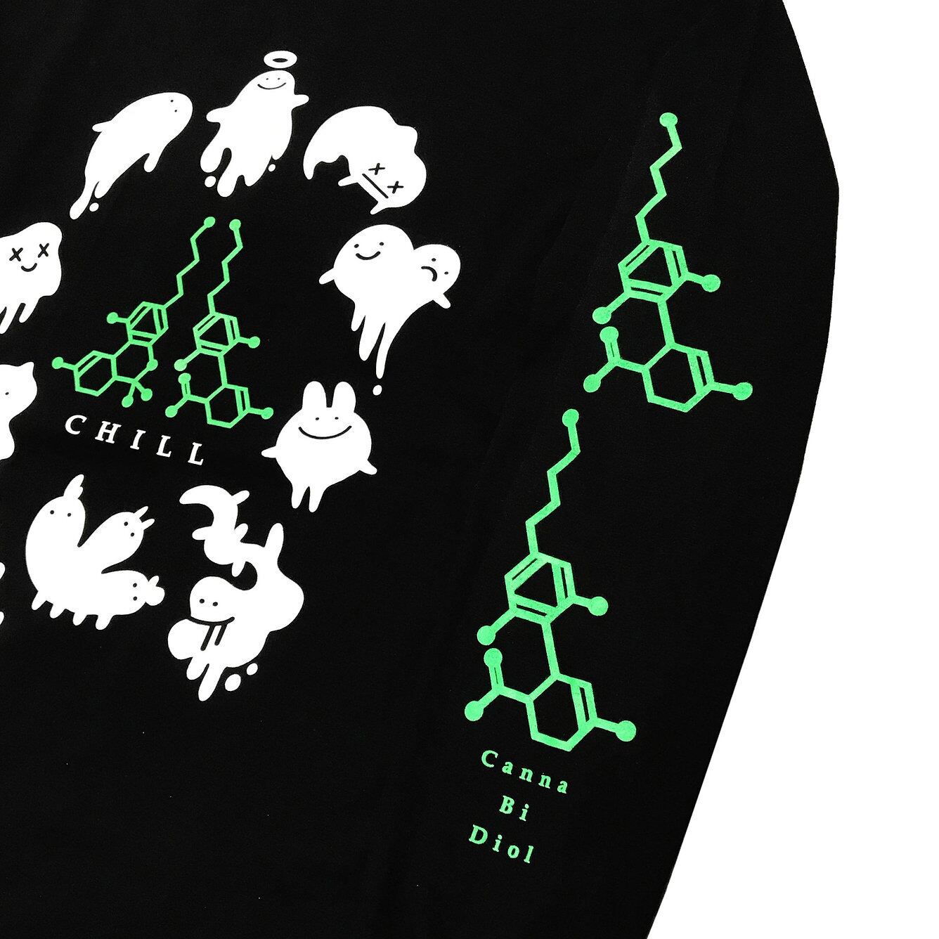 The chemical structures of THC and CBD are designed on the right and left sleeves, respectively.